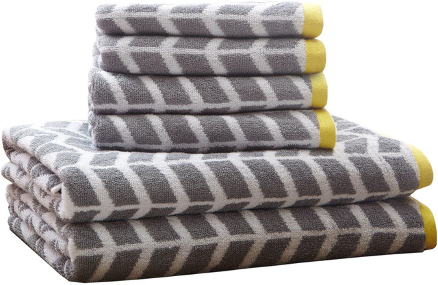 Intelligent Design Nadia 2-ply ring spun towels are cotton jacquard woven making them reversible in contrasting colors. Towels feature geometric print with contrast color dobby border. Set includes 2 bath towels (28'' x 54'') and 4 hand towels (16''x 26'').