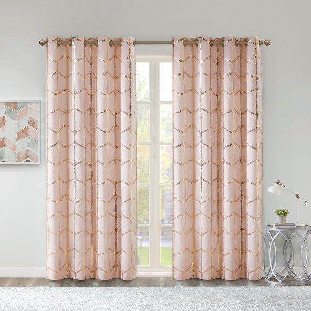 The stunning panel flaunts a geometric, metallic print against a vibrant background for a fun and eye-catching look! Finished with a heavy 3 pass foamback liner, this panel is 100% total blackout providing energy efficiency and added privacy. Grommet top makes this panel easy to hang, open, and close through the day. Machine washable for easy care; complete the collection with coordinating bedding and shower curtain sold separately.
