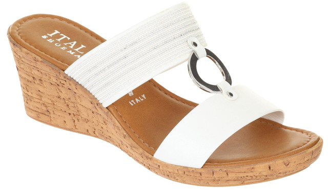 A quality pair of sandals by Italian Shoemakers that provide a stylish look. These wedge sandals feature decorative double-band fabric upper, O-ring detail, thong styling and comfort padded footbeds. Heel height approximately 2 in.