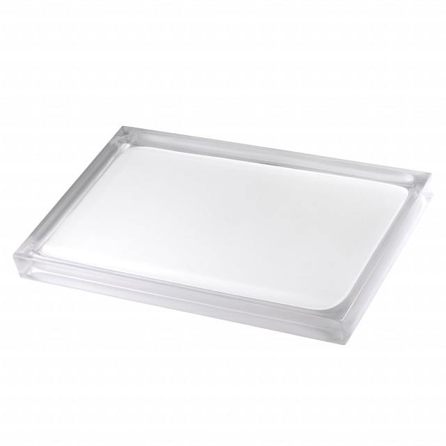 The Izod Marina White Vanity Tray features a clear resin exterior that shows off the white interior for a sleek, modern look. Measuring 5 W x 10 long, it's the perfect addition to any bathroom, bedroom or office. Made of durable resin for years of use.