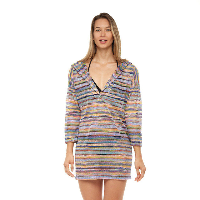 Embrace vibrant elegance with this rainbow long sleeve hoodie cover-up dress. Crafted from luxurious Bohemian Nights fabric, it features a touch of metallic for added flair. Perfect for poolside lounging, resort stays, or beach outings, this cover up combines comfort with a chic, bohemian style. Elevate your sunny adventures with this stylish and sophisticated cover up.