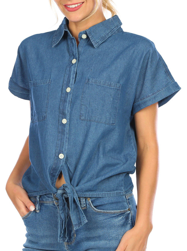 This top features a solid color design on lightweight woven fabric, collared neckline with button down front closure, roll cuff sleeves, front tie, and a casual styling. Top length measures approximately 26 inches from shoulder to hemline. Fabrication is 100% cotton.
