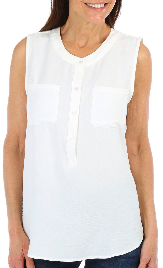 This sleeveless top features a solid color design on lightweight fabric, a scoop neckline, button placket, and a relaxed fit. The top length measures approximately 28 in.