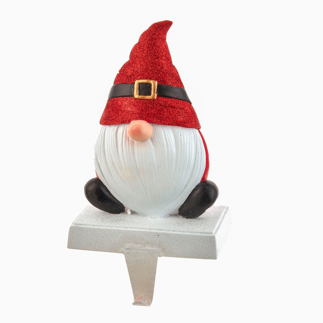 This 10-Inch Resin Gnome Stocking Holder from Kurt Adler is a fun and festive addition to any holiday décor. With his nose peaking out from beneath a red glittered hat with Santa belt and a glittery white base, this stocking holder is the perfect addition to any gnome or Christmas collection. Measures 5 in. x 6.375 in. x 10 in.