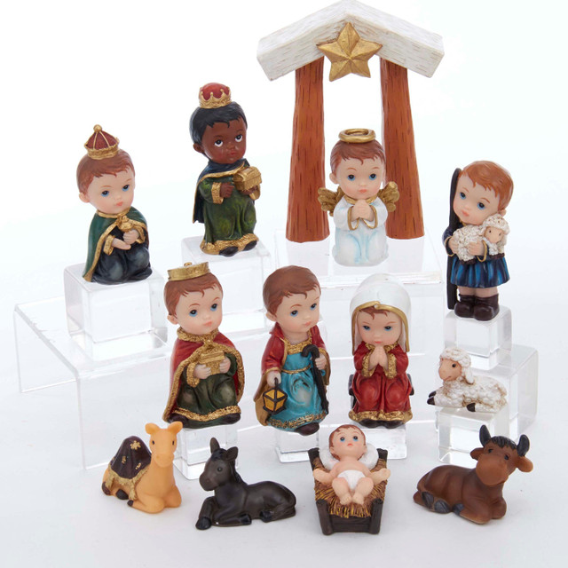 Celebrate and remember the true meaning of Christmas in a new, fun way with this 1.6-4.5 in. Children's Nativity, 13-Piece Set by Kurt Adler. Each adorable figurine in this set dressed up as one of the important figures of the first Christmas in Bethlehem, including a stable, the Holy Family, the Three Wise Men, an angel, a shepherd, sheep, donkey, cow, and camel. Measures 3.6 in. x 1.6 in. x 4.7 in.