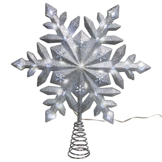 The 13-Inch 25-Light LED Glittered Snowflake Tree Topper is the perfect addition to your holiday decorations. Measuring 13 inches in diameter, the snowflake is covered in glitter that sparkles in the light, adding a touch of glamour to your Christmas tree. The snowflake is lit by 25 LED lights that give off a warm, white glow, highlighting the intricate details of the snowflake design. Measures 12 in. x 0.3 in. x 13 in.