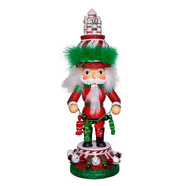 Hollywood Nutcrackers is a whimsical collection of nutcrackers created exclusively for Kurt S. Adler, Inc. and features an assortment of designs that put a unique, vibrant, memorable twist on traditional nutcrackers. This 15-inch Red, Green and White Candy Tower Hat Nutcracker is a fun and festive addition to any home or office holiday decor. This design features a nutcracker in a red and green glittered suite holding a strand of green and red candy.