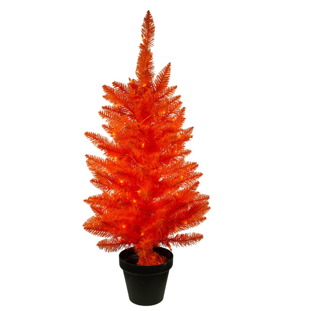 The 3 ft. Pre Lit Orange Potted Tree from the Kurt Adler Halloween collection is a great addition to a Halloween setup. Its all-orange design has 118 tips, a 20-inch diameter, and is pre-lit with 50 UL-approved orange incandescent light bulbs. This tree can be used for other occasions as well. It comes with a potted base. Measures 20 in. x 20 in. x 36 in.