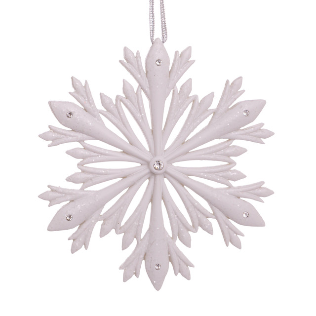 Celebrate the season with Kurt Adler's 4-Inch Elegant Snowflake Ornament with Swarovski Elements. This resin white elegant snowflake is exquisitely embellished with silver glitter and 7 Swarovski Elements. The center of the snowflake features one 4mm Swarovski element and is surrounded by six 2.5mm Swarovski elements. This ornament is for indoor use only.