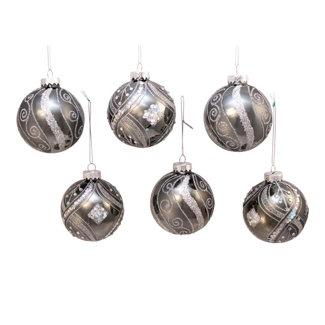 These Matte and Shiny Silver with Glitter Glass Ball Ornaments are a classic addition to your home holiday décor or Christmas tree. Each glass ball ornament in this set features an intricately designed pattern using silver glitter. This set includes two different patterns. Measures 3.15 in. x 3.15 in. x 3.15 in.