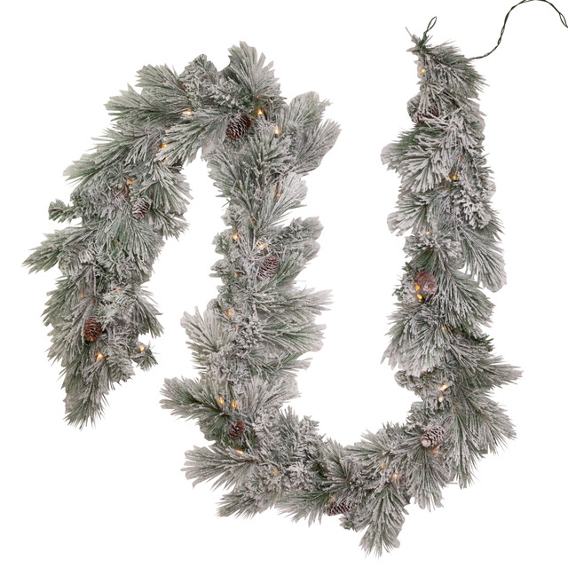 This 9-Foot Pre-Lit Clear Incandescent Flocked Garland from Kurt Adler is a beautiful and festive addition to any holiday décor. Perfect for decorating your home, its design is faux snow green flocked with pinecones and is pre-lit with 50 clear incandescent lights which includes a UL plug and 120 tips. Measures 108 in. x 5 in. x 5 in.