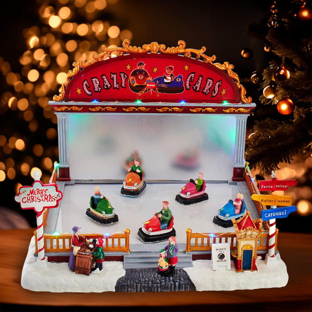 Bring the fun of bumper cars home with this 9-Inch LED Light-Up Musical Bumper Cars Table Piece from Kurt Adler! This table piece features 5 kids in the rink while the families watch. When activated, the table piece lights up to the tune, Jingle Bells. Measures 13 in. x 12 in. x 9 in.