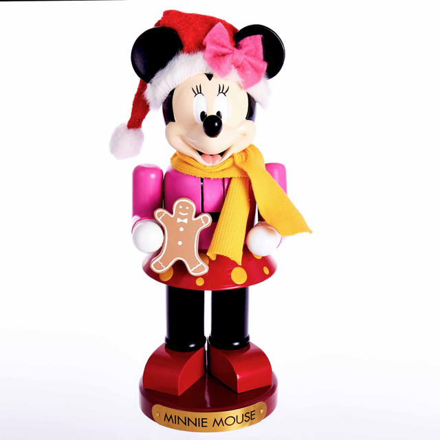 This 10-Inch Minnie Mouse Nutcracker from Kurt Adler is a fun and festive addition to any holiday décor or nutcracker collection! Minnie Mouse is featured here wearing a red and white Santa-style hat, a pink shirt, and a warm yellow scarf. For an extra festive touch, she is holding a gingerbread man cookie. Perfect for Disney fans and collectors!