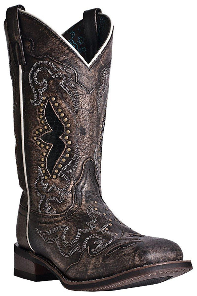 Cowboy approved, the Spellbound boot is crafted in sanded goat leather and features snake print details and pattern stitching & studs. Pull tabs and dip opening allow for easier pull-on. Shaft height 11''.