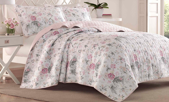 Laura Ashley offers superior comfort for a restful night's sleep. This quilt set features 100% cotton fabrication and a breezy floral print with a polka dot reverse. Set includes one quilt and two pillow shams (one for twin size).