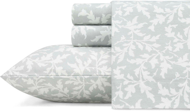 Add an extra layer of warmth to your bedding ensemble with this Crestwood Flannel Sheet Set from Laura Ashley. Sheets feature an allover pattern of swirling white leaves on a soft dove gray background creates a cool winter garden print in a sophisticated neutral tone. Set includes flat sheet, fitted sheet, and 2 pillow cases (1 twin).