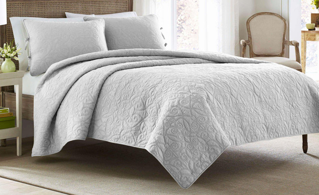 Laura Ashley offers superior comfort for a restful night's sleep. This quilt set features 100% cotton fabrication and an elaborate scroll stitching with a trellis pattern. Set includes one quilt and two pillow shams (one for twin size).