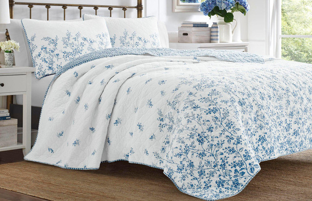 Laura Ashley offers superior comfort for a restful night's sleep. This quilt set features 100% cotton fabrication and a scattered floral design with a diamond print reverse. Set includes one quilt and two pillow shams (one for twin size).