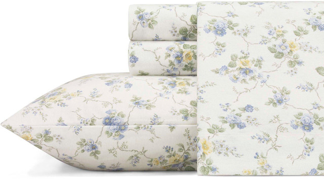 Laura Ashley Le Fleur Flannel Sheet Set features an elegant floral design and 100% brushed cotton flannel. Set includes one flat sheet, one fitted sheet, and two pillowcases (one for twin size).