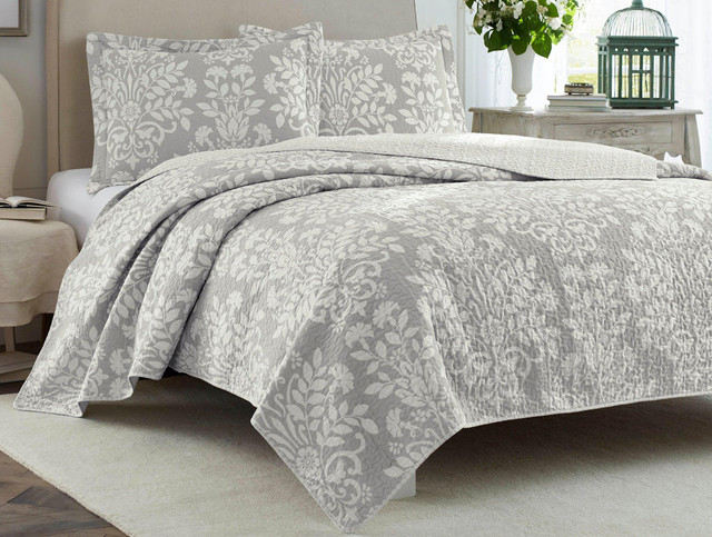 Laura Ashley offers superior comfort for a restful night's sleep. This quilt set features 100% cotton fabrication and a classic damask design with a geometric reverse. Set includes one quilt and two pillow shams (one for twin size).