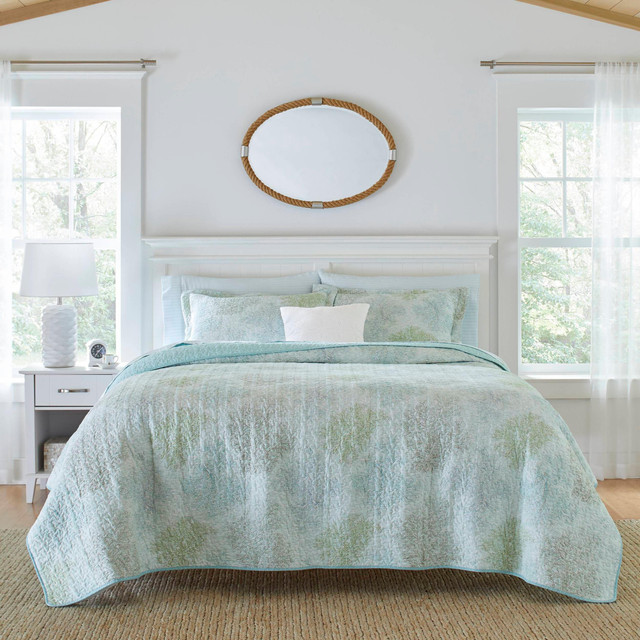 Delicate seaweed branches floating on a watery background bring the beauty of an underwater garden to your bedroom in the saltwater quilt set. Turquoise blue, green and brown accents on a crisp white ground with subtle aqua stripes are cool and serene for a tranquil night sleep. The quilt reverses to a crisp white dot on bright turquoise.
