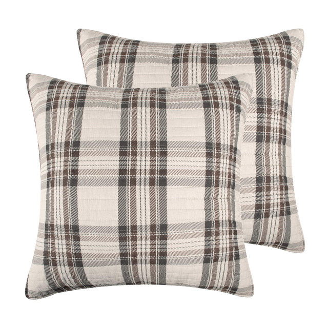 The Lodge Toile Quilted Euro Sham Set of 2 by Levtex Home is inspired by the serene and rustic nature of a mountain get away. Offered in brown, cream and charcoal, this design will immediately transform your bedroom. These shams feature a brown, cream and charcoal tartan plaid. The Euro Sham Set of 2 (26 x 26 in.) is cotton front and back, quilted with a cotton rich filler and is machine washable. Pillow inner not included.