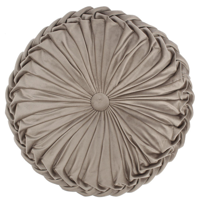 The Round Velvet decorative pillow perfectly complements the Levtex Home Pisa bedding collection. This pillow is sized at 16in. round and features a patterned pleated velvet with a button center The color palette makes this a versatile accessory for your bed, couch or favorite chair. The pillow comes pre-filled with a soft, luxurious feather inner.