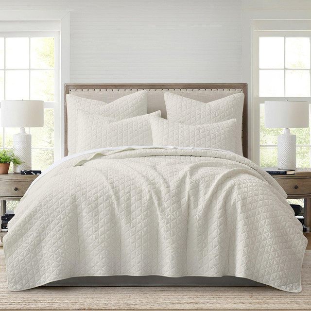 The Rowan Reversible Quilt & Sham Set by Levtex Home is inspired by boho chic fashion. This reversible quilt features beautiful chic crinkle quilted diamond design on the front, reversing to a solid cream on the back. The Quilt & Shams have a microfiber front and back, filled with a cotton-rich filler and are machine washable. Enjoy this for years to come!