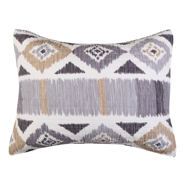 The Santa Fe Quilted Standard Sham by Levtex Home is inspired by ancient handmade patterns. Offered in grey and tan ikat, this design will immediately transform your bedroom. This sham features geometric ikat design in neutral greys, creams and tans in cotton on the front, reversing to a diamonds in microfiber on the back. The Standard Sham (26x20in.) is quilted with a cotton rich filler and is machine washable. Pillow inner not included. Enjoy this for years to come!