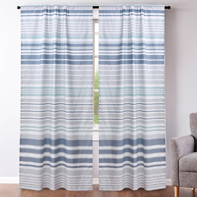 The Truro Drape Panel with Rod Pocket by Levtex Home is inspired by blue ocean waters. Offered in blue and white, this design will immediately transform your room. This drape panel features contemporary coastal stripe design, and includes a rod pocket for easy hanging. Panel measures approximately 55 x 84 inches.