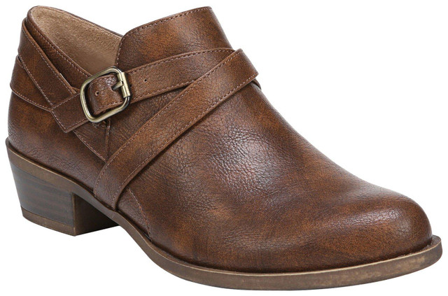 A bootie with all the right details. Slip into the ultra-comfy Adley bootie from LifeStride. Faux leather upper with a round toe, slip-on fit, and wraparound strap detail with metallic buckle accent. Soft System® comfort package provides all-day support, flex, and cushioning.