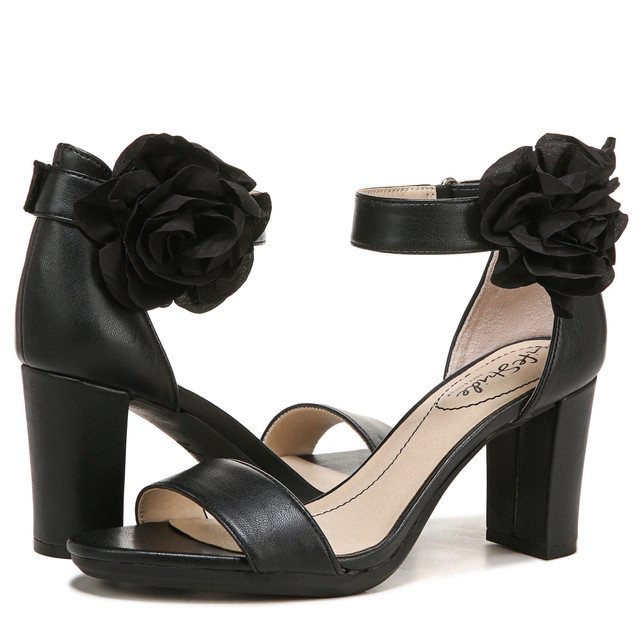 Adorned and adored. Attention-getting womens dress heels perfect for every special occasion. Faux leather with a round open toe, adjustable ankle strap with built-in stretch, and decorative fabric flower. Heel counter, linings, and insole board partially crafted with recycled materials. Soft System® comfort package provides all-day support, flex, and cushioning. Traction sole provides you with extra stability. Just Right Height 3 inch heel.