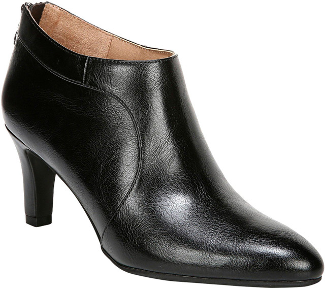 Sleek & sophisticated, this comfy bootie adds a chic feel from work to weekend & beyond. Faux leather upper with a softly pointed toe, back zip, & shootie silhouette. Soft System technology provides support, flex, & cushioning.