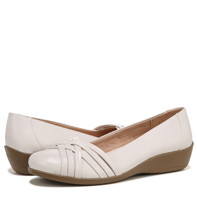 Go everywhere life takes you this season in a stylish flat with cute crisscross straps over a rounded toe. Faux leather with a round toe, slip-on fit, lightweight and flexible design, and overlapping strap design. Toe box, heel counter, and linings partially crafted with recycled materials. Soft System® comfort package provides all-day support, flex, and cushioning. Get next-level comfort with Velocity 2.0®, featuring luxe linings, superior cushioning, and a premium insole.