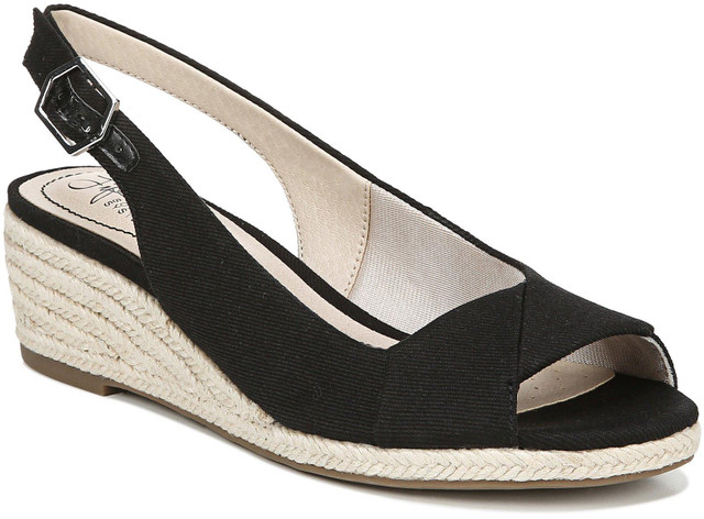 Look fresh and fashion-forward in the comfy Socialite wedge sandal from LifeStride. Fabric upper with a peep toe, heel sling strap with adjustable buckle closure, foldover detail at the toe, and espadrille-inspired jute-wrapped wedge. Soft System comfort package provides all-day support, flex, and cushioning.