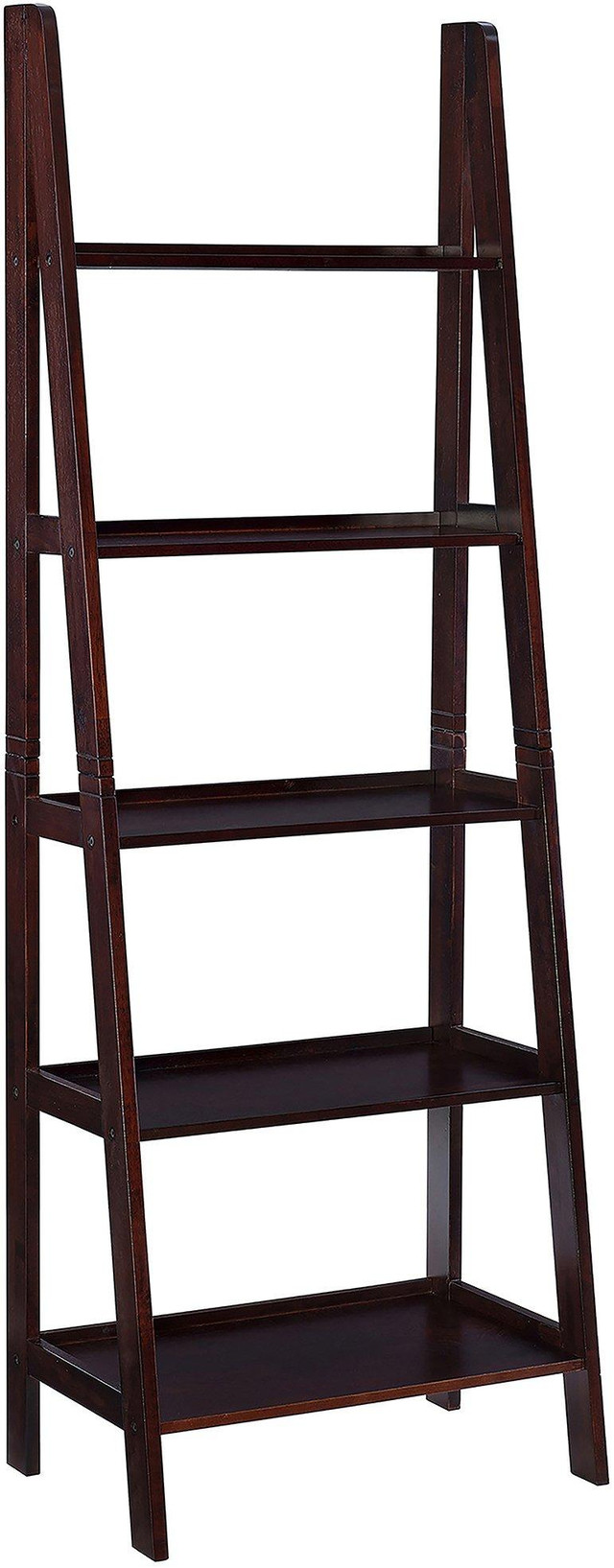 Designed in a clean, open silhouette, enabling you to show off not only your top favorite titles but also décor objects and knickknacks. This black painted bookcase features five shelves in decreasing depth and is designed to fit easily into taller, narrower spaces. Use in a home office, living room, bathroom or entryway to provide ample open storage. Measures 35.35in x 16.5in x 72in.