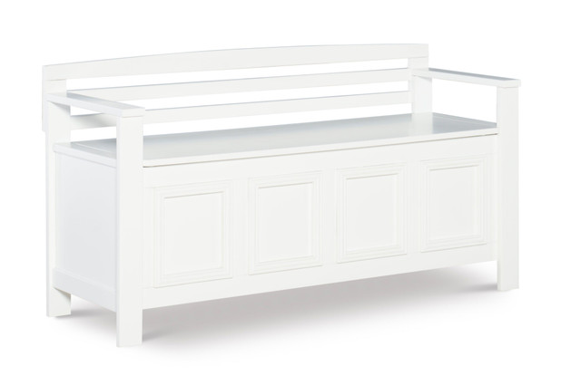 Create added seating and storage to your foyer or mudroom with this attractive and functional Conyers Storage Bench. The bench features a flip top lid, allowing to easily retrieve articles from the storage compartment. The ladder designed back and decorative front are enhanced by the white finish. A stylish and functional addition to any home. Measures 46W x 17D x 25H.