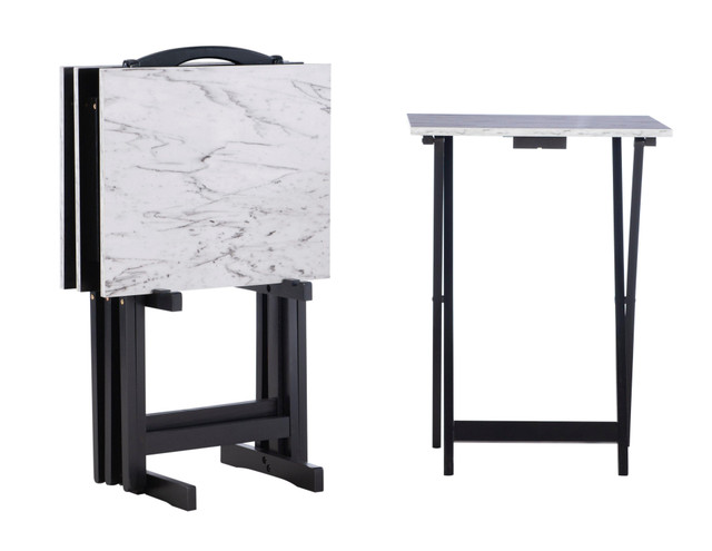 The Fitz Faux Marble Rectangular Table Set has a distinctive look with its sturdy wood construction and faux marble top. This set includes foldable trays and one storage stand. The handle on the top of the stand makes it easy to transport the entire set from one room to another. Measures 18.9W x 15.75D x 26.38H.
