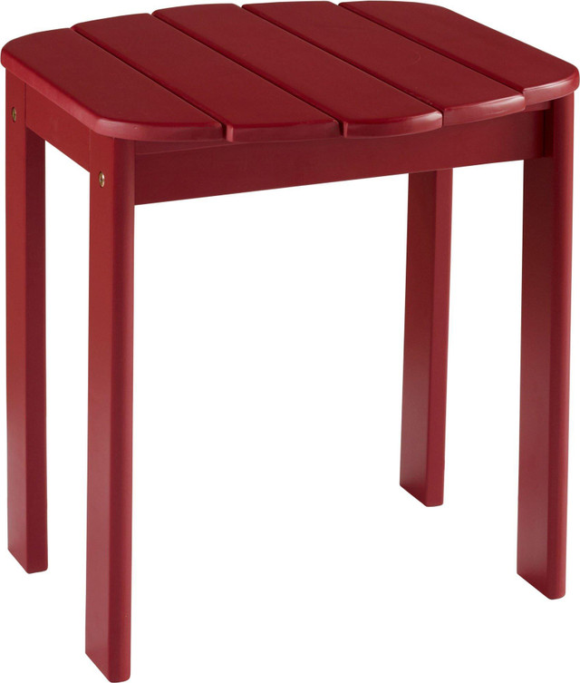 Linon skillfully combines the latest trends with quality home decor. Sturdy and durable, the Adirondack End Table is the perfect size to complement outdoor chairs and loungers. The spacious top provides ample space for keeping a drink, snack and book. The solid finish is sure to add a splash of color to your outdoor space. Measures 18.11''W x 18.5''D x 18.11''H.