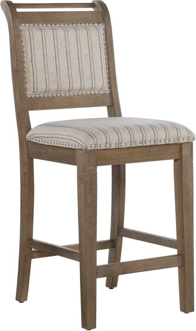 French style and farmhouse design combine to create the Stella Gray Counter Stool. The washed finished wood is perfectly accented by the stripe ticking fabric and brushed silver nailheads. Footrails provide stability and durability. 18.25w x 22d x 41h. Holds up to 275 lbs. Seat height 26 inches.