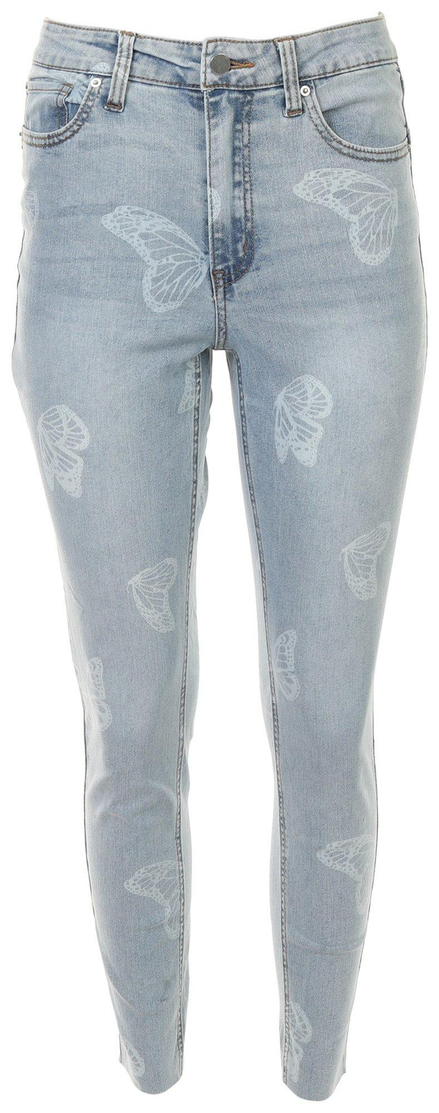 These jeans feature a stylish and simple butterfly pattern on solid-color denim, a mid-rise skinny fit, classic 5-pocket styling, button and zipper-fly closure, and frayed cut-off hems. The inseam measures approximately 27 in. Fabrication is 68% Cotton, 25% Polyester, 6% Rayon, and 1% Spandex.