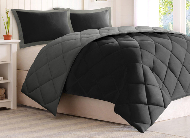 This comforter is made from ultra-soft microfiber and features 3M Stain Resistant Treatment that helps release stains easily. The down alternative filling provides extra warmth and softness, while the diamond quilting prevents the fill from shifting, providing an even distribution of warmth. Comforter is completely reversible. Set includes comforter & 2 shams (one twin).