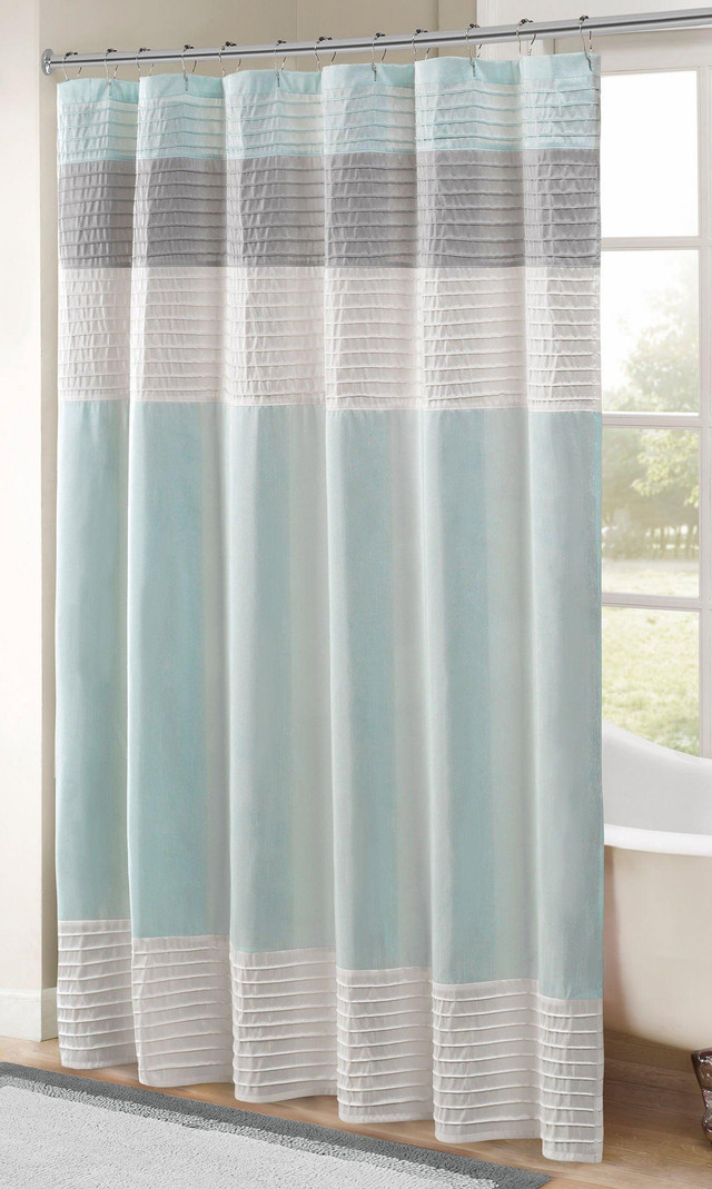 This Madison Park Amherst Shower Curtain features piecing and pintucking details to create a faux dupioni fabric that is easy to care for. 100% polyester. Measures 72''L x 72''W.