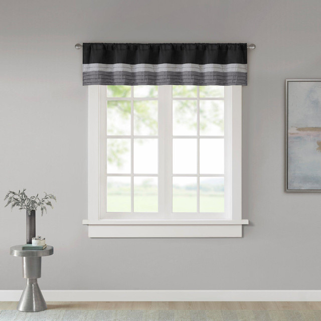 Madison Park Amherst Polyoni Pintuck Window Valance is a simple way to add style to your room. This window valance features a modern striped design in dark hues of black, charcoal, and silver combined with pintuck detailing for beautiful texture and dimension. The added lining helps filter the perfect amount of light and creates fullness for better drapability. Finished with a rod pocket top, this window valance fits up to a 1.25 diameter rod.