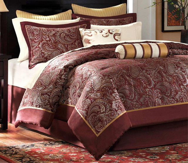 The jacquard weave is inspired from an updated paisley motif and is woven into a beautiful combination of burnt red, gold and a hint of platinum. The comforter and shams offer beautiful details with a 2 flange and 1/2 flat piping in burnt red. The reverse of the comforter is a rich red color. Set includes comforter, bed skirt, flat sheet, fitted sheet, 2 pillow shams, 2 euro shams, 2 pillow cases & 2 decorative pillows. Pillows measure: 18'' x 18'' & 12'' x 18''.