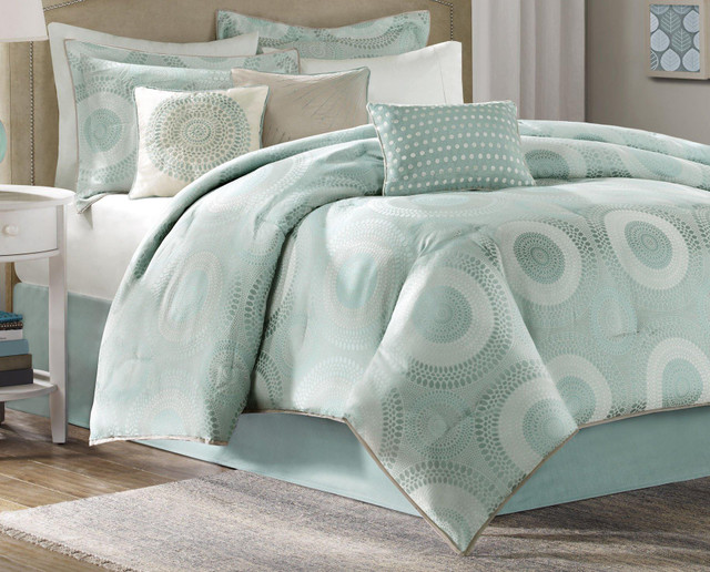 Madison Park Baxter Set features a polyester jacquard fabrication in seafoam with a medallion motif across the comforter. Set includes comforter, 2 pillow shams, 1 bed skirt (15'' drop), and 3 decorative pillows. Pillows measure 16'' x 16'', 18'' x 18'', and 12'' x 18''.