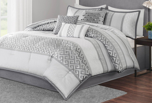 The Bennett Comforter Set features soft shades of charcoal and silver. Several geometric prints adorn this collection working together in large and small stripes for an updated traditional look. Set includes comforter, 2 pillow shams, 1 bed skirt (15'' drop), and 3 decorative pillows. Pillows measure 16'' x 16'', 18'' x 18'', and 12'' x 18''.