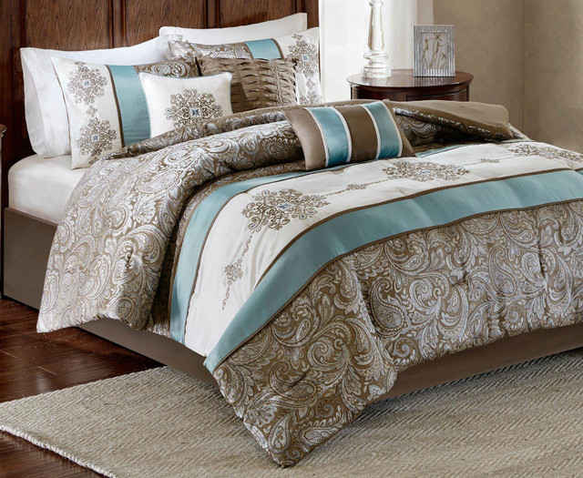 The Madison Park Caroline Comforter Set is printed with an elegant paisley pattern in a soft color palette of blue, brown, and ivory. The intricate design is separated by brown piping and two blue strips with four beautifully embroidered medallions stitched onto the ivory center. A solid brown reverse provides a pleasant neutral touch. Set includes comforter, 2 pillow shams, 1 bed skirt with 15'' drop, and 3 decorative pillows.