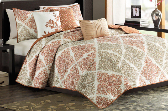 Madison Park Claire Set features a crisscross design with small leaf print inside each diamond with pops of spice. Coverlet reverses to a solid spice. Set includes coverlet, 2 pillow shams, and 3 decorative pillows. Pillows measure 16'' x 16'', 18'' x 18'', and 12'' x 18''.