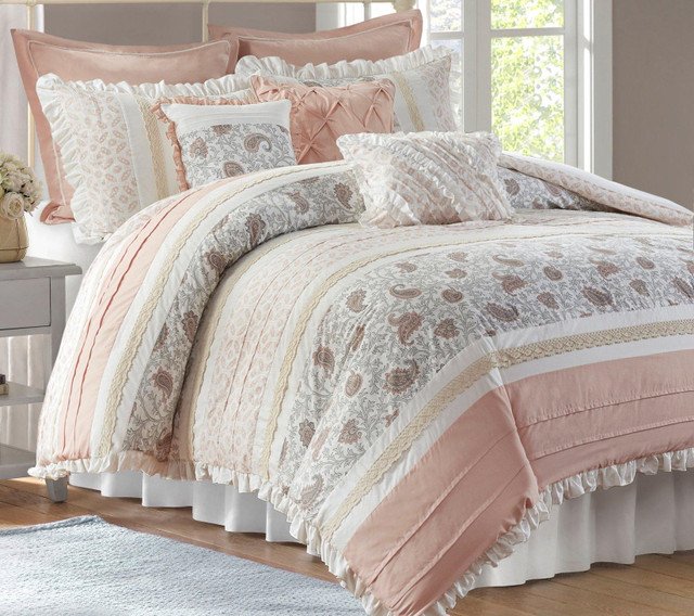 The Madison Park Dawn 9 Piece Cotton Percale Comforter Set offers a shabby chic update to your bedroom decor. A paisley print is featured on the cotton comforter with pintucked fabric separated by lace taping embellishments. Around the edge, a ruched flange adds a graceful touch, for a charming cottage look. Set includes comforter, bedskirt, 2 shams, 2 euro shams and 3 decorative pillows.